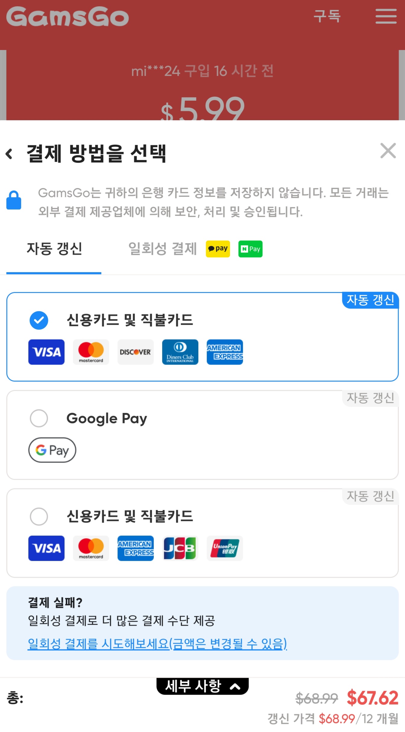 결제는 국내 카드나 간편 결제 수단을 통해 가능합니다. 개인적으로 저는 네이버페이를 이용해 결제했습니다. 카카오페이는 간편한 결제 방식으로 많은 사용자에게 인기가 높습니다. 또한 1개월 요금보다는 3개월 또는 12개월 일괄 지불 방식이 할인율이 더 높으니, 가능하다면 한 번에 결제하는 것을 추천합니다. 특히 자주 사용 하지 않는 분들은 6명 그룹으로 공유하면 더욱 비용을 절감할 수 있습니다.