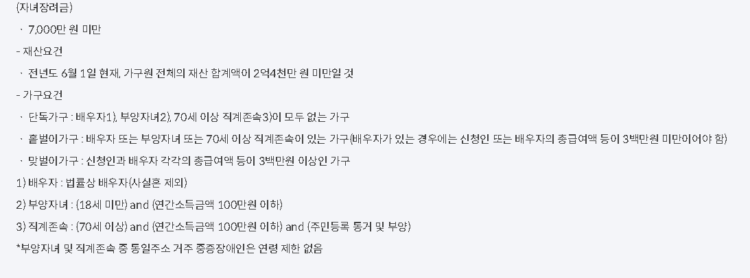 3.재산 요건:전년도 6월 1일 기준으로 가구원 모두가 소유하고 있는 주택·토지·건물·예금 등 재산 합계액이 2억4000만원 미만이어야 합니다. 부채는 차감하지 않습니다. 부동산, 전세금, 자동차, 예금 등이 포함되며, 재산합계액이 1억4천만원 이상이면 50%만 지급됩니다.
